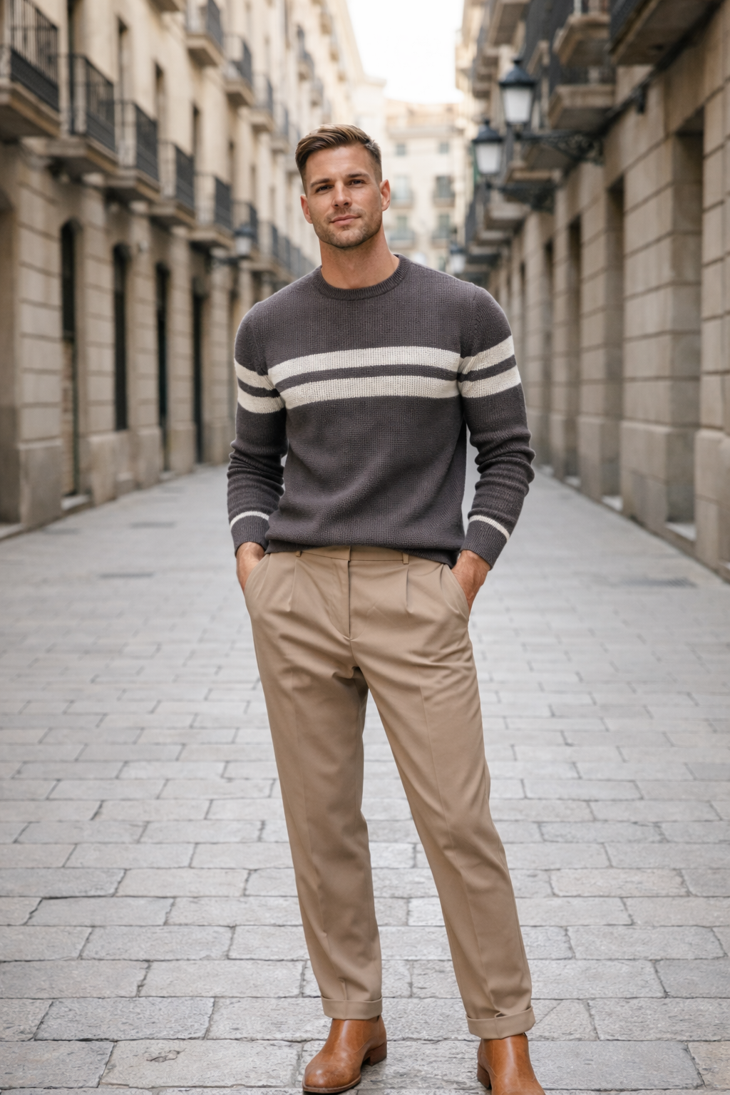 A men’s sweater designed in a soft, neutral tone with a simple silhouette that works easily with everyday outfits. The clean lines give it a relaxed, polished look suitable for casual routines as well as more put-together settings.